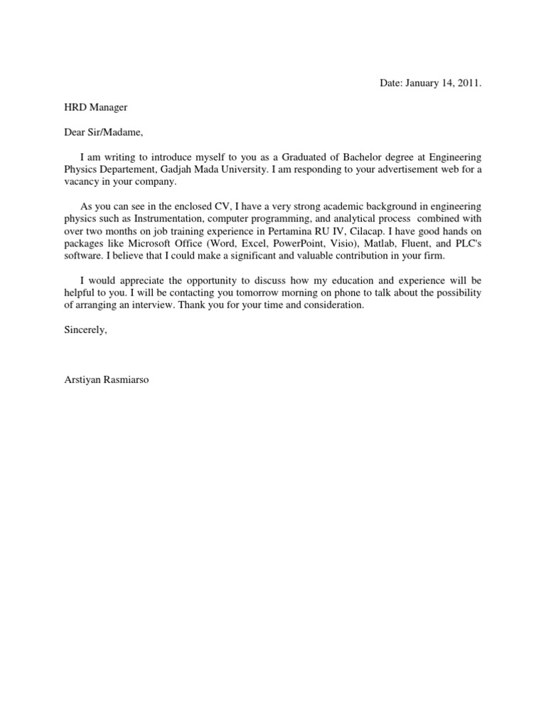 Cover letter or job application letter is a letter prepared and sent by someone who wanted to work in an office, company or other agencies. Ingat, email anda hanya akan dibaca tidak lebih dari sepuluh detik. Contoh selanjutnya ialah untuk para fresh graduate. A creative cover letter can make your job application stand out from the rest of your competition. Lalu apa bedanya cover letter dengan cv?